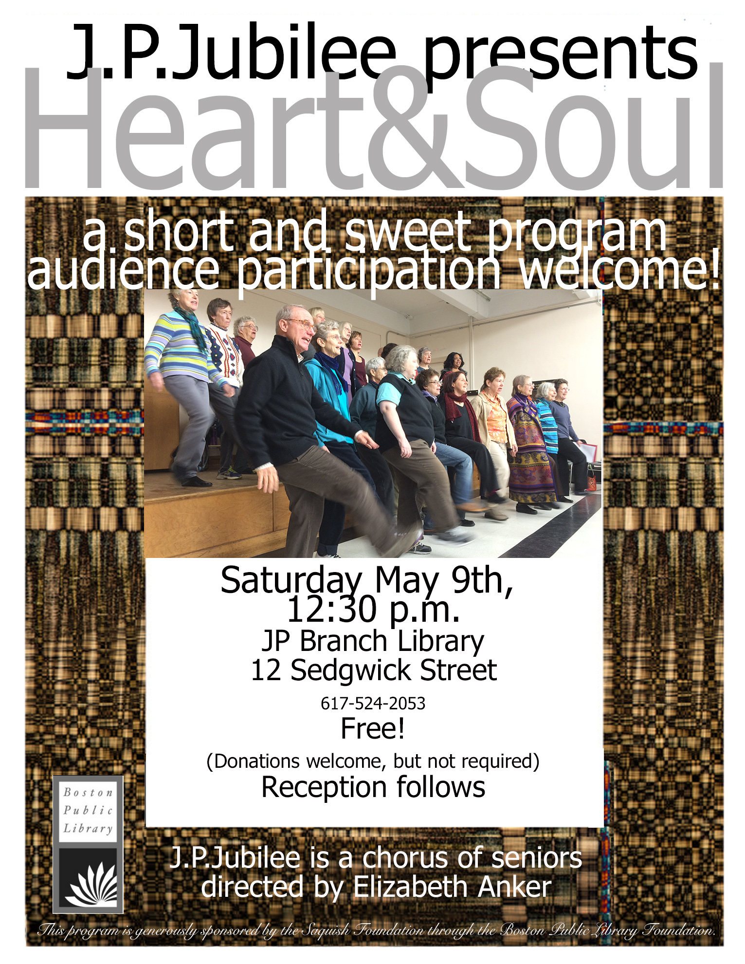 JP Jubilee does their end-of-semester concert on Saturday May 9 at 12:30pm at the Jamaica Plain branch Library.  Flyer below, by our members Lizi Brown and Estelle Disch: