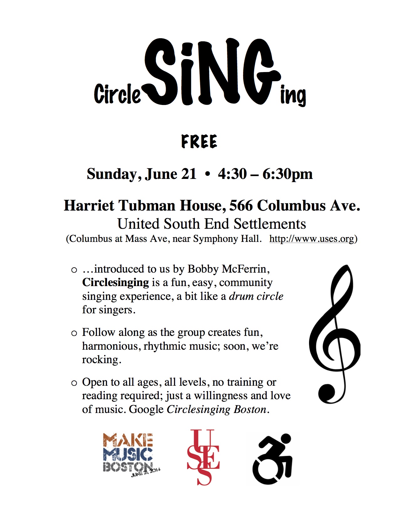 The Platinum Singers meet Wednesdays 2-3:30 starting September 17 at the Harriet Tubman House, corner of Mass and Columbus Avenues in the South End. Nearly free: $15/12 classes, and no one is turned away for lack of funds.  Contact hviarruel@uses.org to register.  www.uses.org
