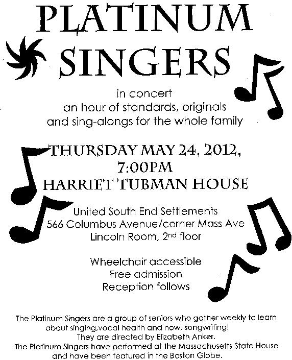 This Saturday the United South End Settlements–the facility which sponsors our Singers– is honoring a wonderful community leader, and we get to sing with some teens from the Choral Union of the Boston Children’s Chorus. We all got a lift when we met to rehearse last weekend, watching the kids do their body percussion as they sang, and working on an African folk song all together.